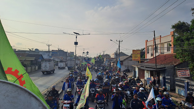 Karawang, Rabu 29 November 2023 Buruh Karawang lakukan demo konvoi menggunakan motor menuju ke Bandung,.